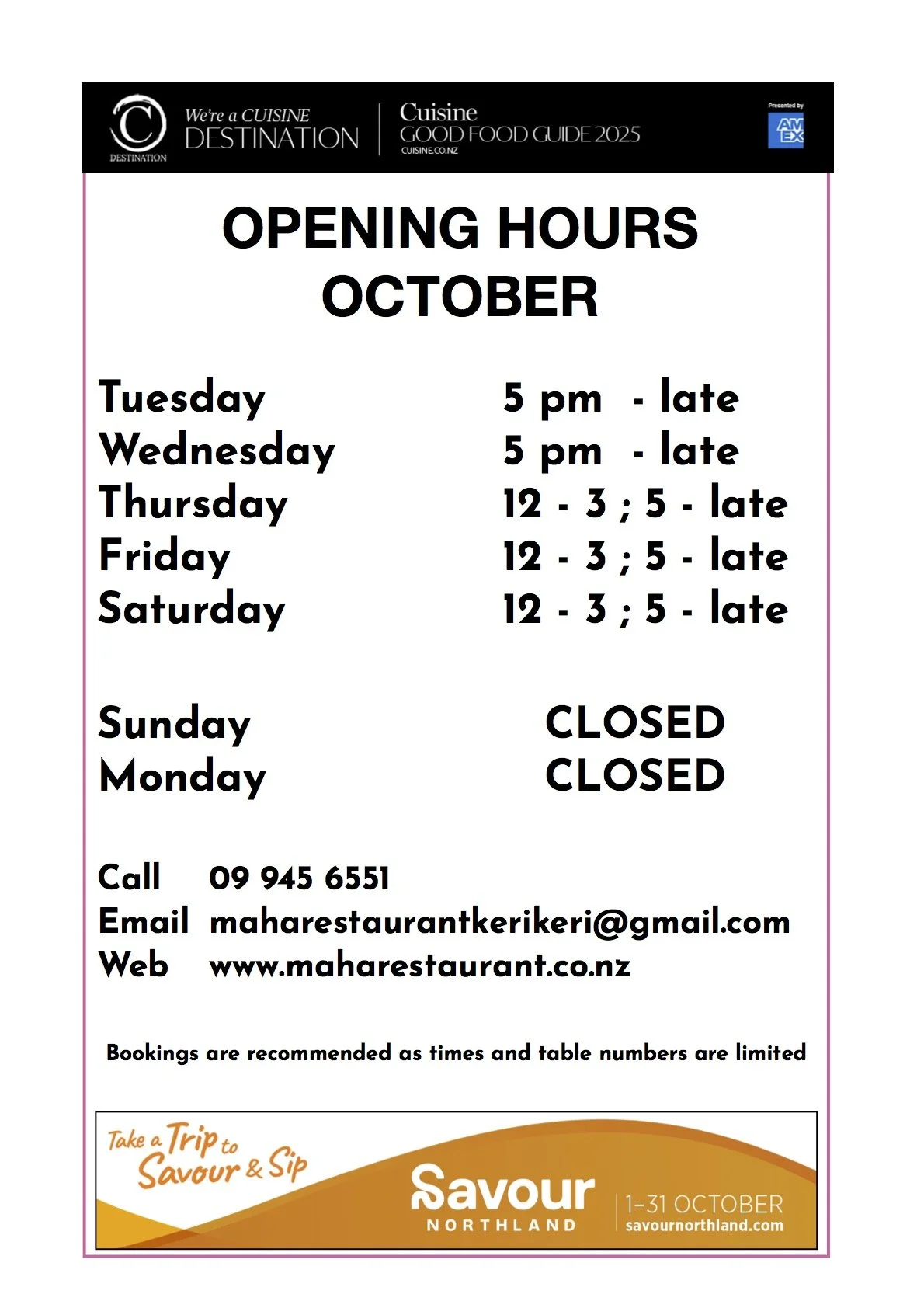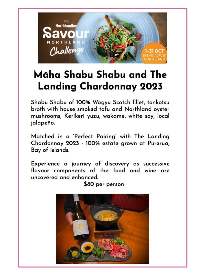 Savour Northland is back over the whole month of October so you can experience our Perfect Pairing dish Māha Shabu Shabu with The Landing Chardonnay 2023. (See the link above). We also have some new items on the menu - scroll down to the menu link below. Pork Ramen is back too! And on the dessert menu the popular Coconut Cloud is back - paired with roast apple puree, lemon myrtle syrup and our own white sesame gelato.