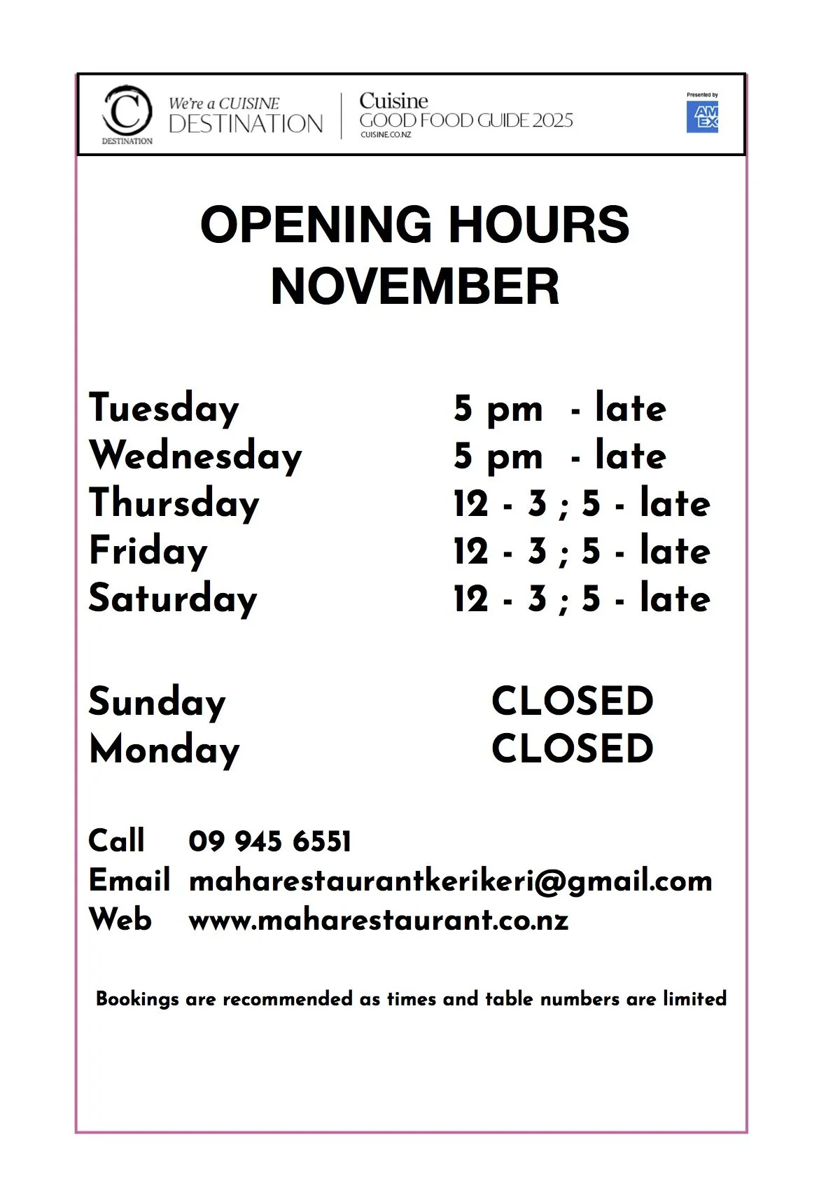 Opening hours are updated monthly - please see our November hours below. We will be updating our December & January hours soon. Meanwhile keep an eye on Google Business.